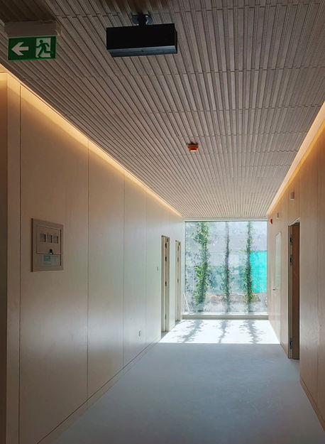 The inclusion of oak wood introduces warmth and softness to the space, while the greenery at the end of the hallways further enhances the calming ambiance, creating a truly inviting environment for patients and visitors alike.